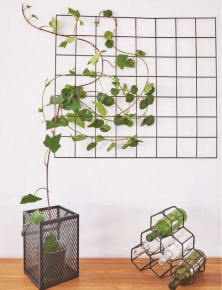 Jednym z popularnych rozwiązań dekoracji ściennych są w ostatnim czasie metalowe ażury, najczęściej pełniące jednocześnie funkcję organizerów. W wielu inspirujących aranżacjach dodatkowym zabiegiem ozdobnym jest wkomponowany i przeplatający się przez drucianą kratę bluszcz Hedera helix. Taki estetyczny zabieg można wykonać z naturalną rośliną, niemniej sklepy dekoracyjne oferują na ten cel również sztuczny bluszcz, niekiedy do złudzenia, wręcz nie do poznania, imitujący żywą roślinę ozdobną z odmian Hedery.