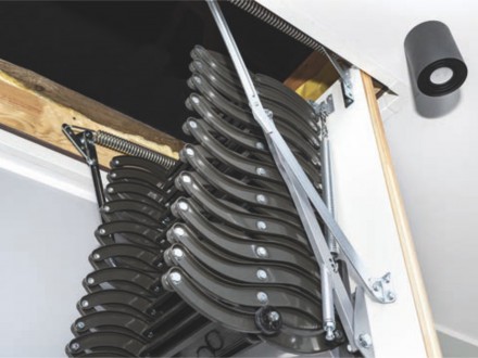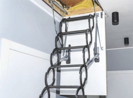 Schody nożycowe składają się w harmonijkę, a po rozłożeniu tworzą stateczną drabinę. Wykonane są ze stali. Najpopularniejsze są modele aluminiowe – solidne, odporne na korozję i bardzo lekkie. Schody nożycowe zajmują w stropie mniej miejsca niż segmentowe, ale pamiętajmy, że mały otwór utrudnia wniesienie na strych przedmiotów sporych rozmiarów. Natomiast bez problemu można je dopasować do wysokości pomieszczenia – wystarczy odkręcić lub przykręcić stopień. Można je montować w pomieszczeniach o wysokości do 330 cm, maksymalne obciążenie wynosi 200 kg.
