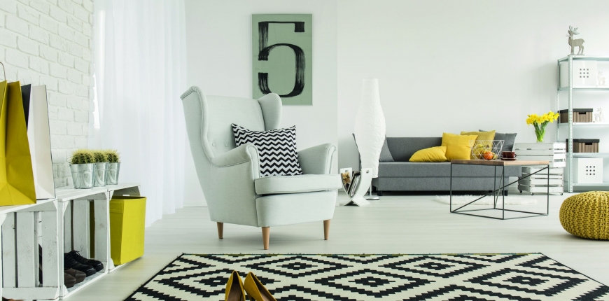 Kolor biały komponuje się pięknie z szarościami (na ściany można wybrać wówczas biel z delikatną domieszką szarości właśnie, aby aranżacja była spójna), które mogą pojawić się w dodatkach, jak chociażby puszysty dywan, czy meblach – również kuchennych, jeśli nasz pokój gościnny jest otwarty na kuchnię, co obecnie stanowi niezwykle popularne rozwiązanie. Industrialnego klimatu doda ponadto zastosowanie betonu architektonicznego na jednej ze ścian i podłoga z żywicy. A oświetlenie w stylistyce loftowej z żarówkami typu „Edison” z pewnością dopełni aranżu. Jeśli natomiast bliższa naszemu sercu jest stylistyka klasyczna, wnętrze w szarościach można okrasić ciekawym kolorem, np. malinowym czy limonkowo-oliwkowym i postawić na obicie tapicerowanych mebli utrzymane w duchu angielskim – może to być chociażby popularny Chesterfield.